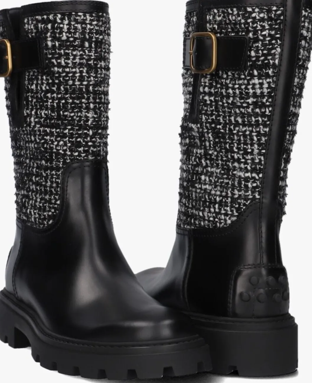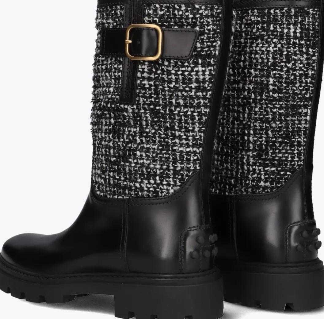 Laars met tweed voor dames van het merk TOD’S. Deze enkellaars met ronde neus is uitgevoerd in zwart leer en zwart witte tweed stof. De buitenzijde van de schacht bevat een goudkleurige gesp. De schacht van de laars loopt recht en heeft geen rits. De binnenzijde is uitgevoerd in leer en een stevig contrefort draagt bij aan het loopgemak. De rubberen loopzool heeft een grof profiel voor stevige grip.