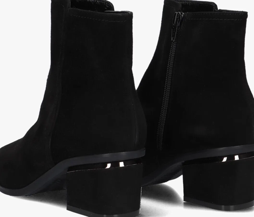 Deze enkellaars met spitse neus is uitgevoerd in zwart suède. De binnenzijde van schacht bevat een rits. De binnenkant is uitgevoerd in leer en een stevig contrefort draagt bij aan het loopgemak. De hak meet circa 5 cm. De rubberen loopzool heeft een medium profiel voor stevige grip.